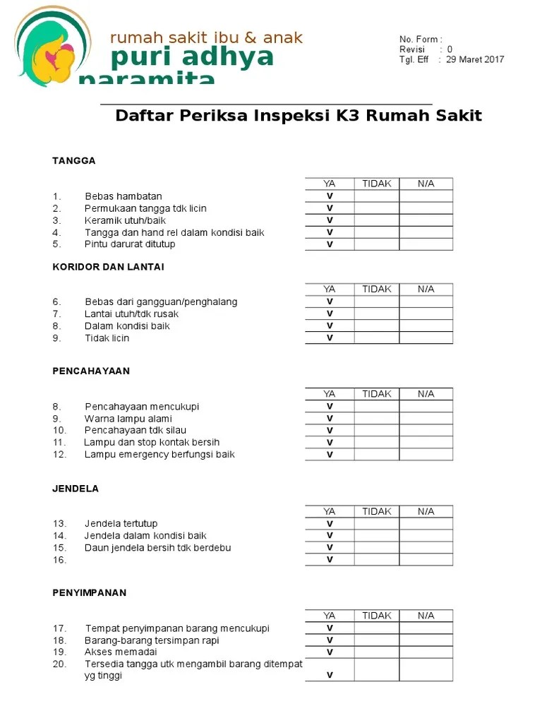 Hasil laporan kecelakaan kerja pada tahun 2018 terdapat 2 karyawan yang mengalami kecelakaan kerja, di mana ada 1 pekerja terjatuh saat berangkat bekerja dari . Sedangkan inspeksi k3 adalah suatu proses untuk menemukan potensi bahaya yang. Berikut ini (lihat lampiran) diberikan sebuah contoh tentang format rencana. 5.2.1 petugas inspeksi k3 terdiri dari. Inspeksi kesehatan dan keselamatan kerja (k3) dapat membantu perusahaan dalam mencegah kecelakaan, cedera dan penyakit akibat kerja (pak).